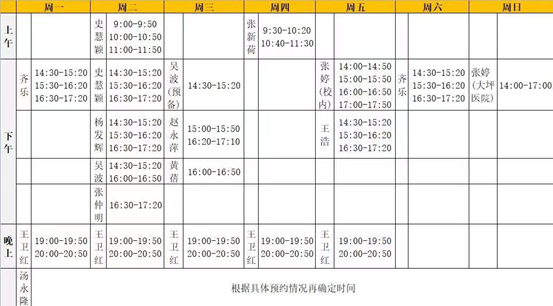 教职工可根据需要预约心理关爱服务,每年可免费咨询6次(可以用于个人、配偶、子女及家庭团体)。教职工可选择校内或校外专家进行心理咨询,所有专家都将遵守职业规范、恪守职业道德,严格为教职工保密。心理咨询师和具体咨询时间可参考下方心理关爱服务预约时间表。