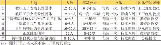 根据教职工及其家属的不同需求,中心将提供多样化的团体辅导。团体辅导主题、年龄要求、时间及带领老师等详情信息参见下表: