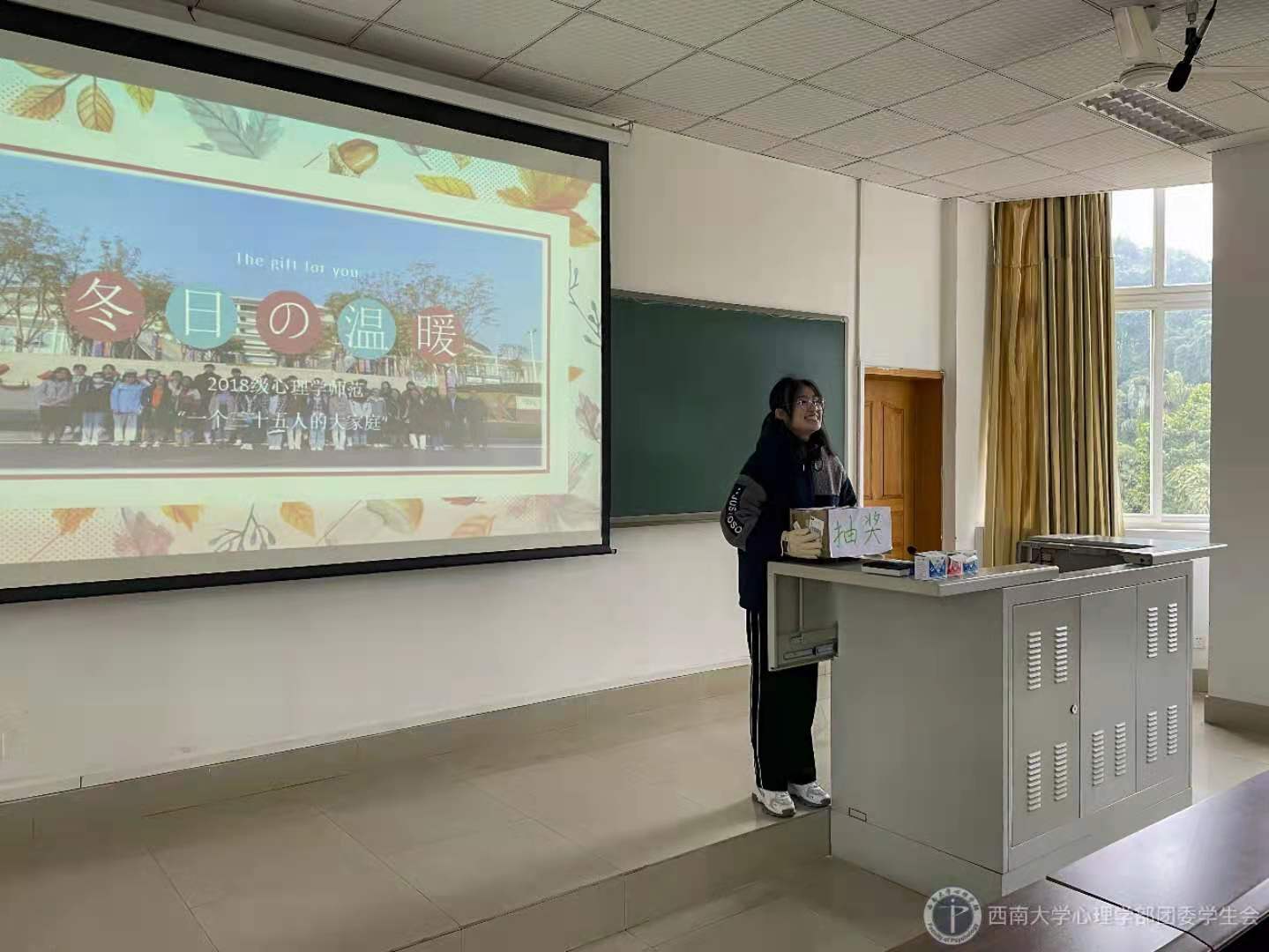 2020年12月18日上午11时,为了增加班级团体凝聚力,缓解同学们期末论文和考试的压力,18级心理学师范班全体同学举办了“冬日送温暖”活动。