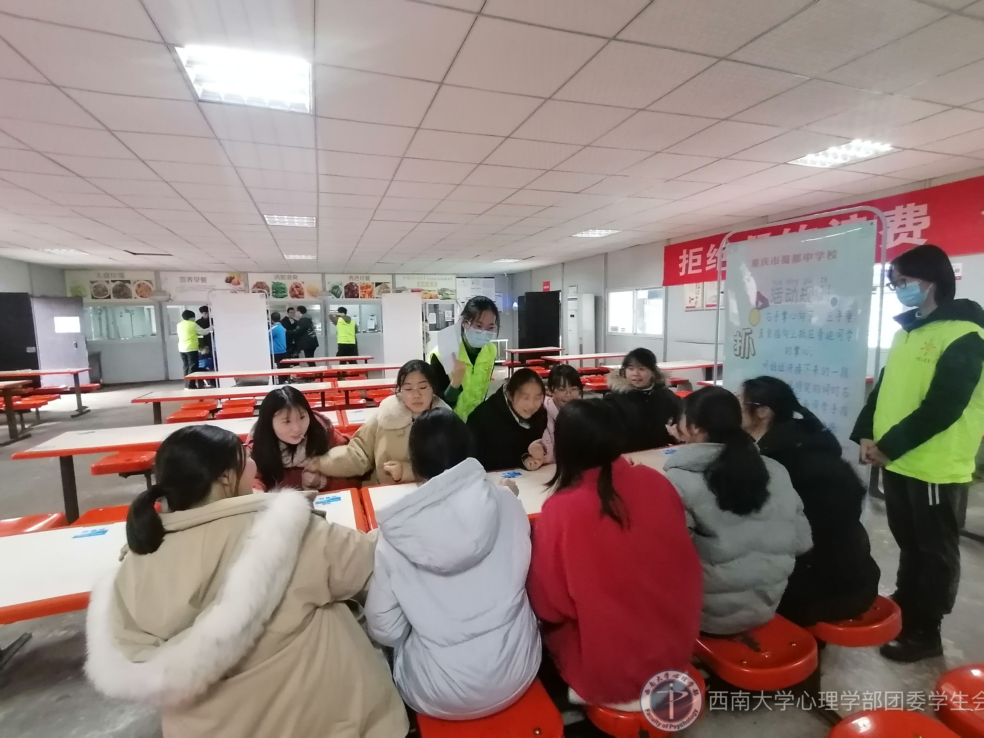 2020年12月15日下午14点,必赢776net必赢776net心晴心理健康志愿服务队咨询队前往蜀都中学举办了心理健康现场活动。咨询部的全体人员和蜀都中学的学生参与了本次活动。