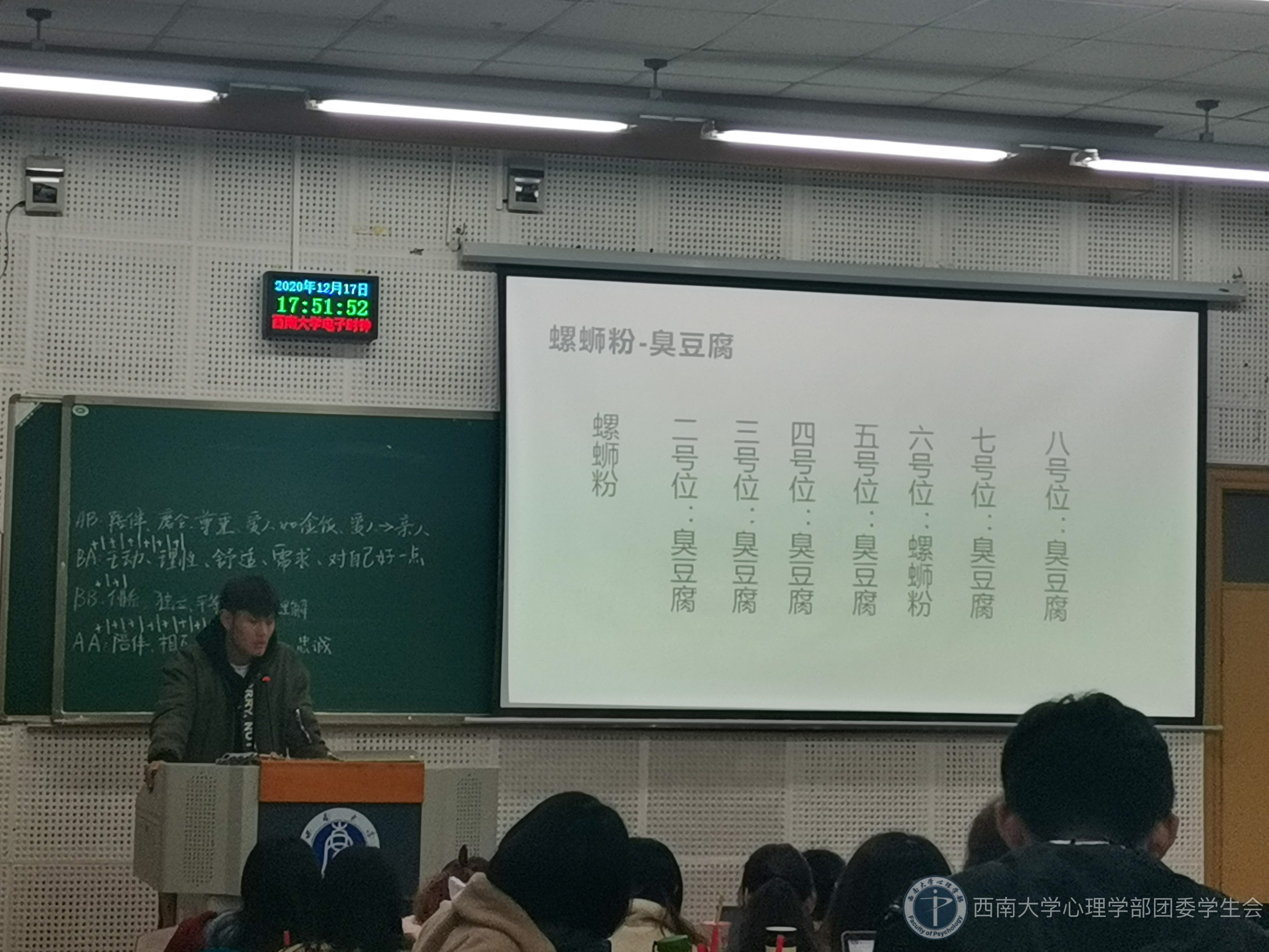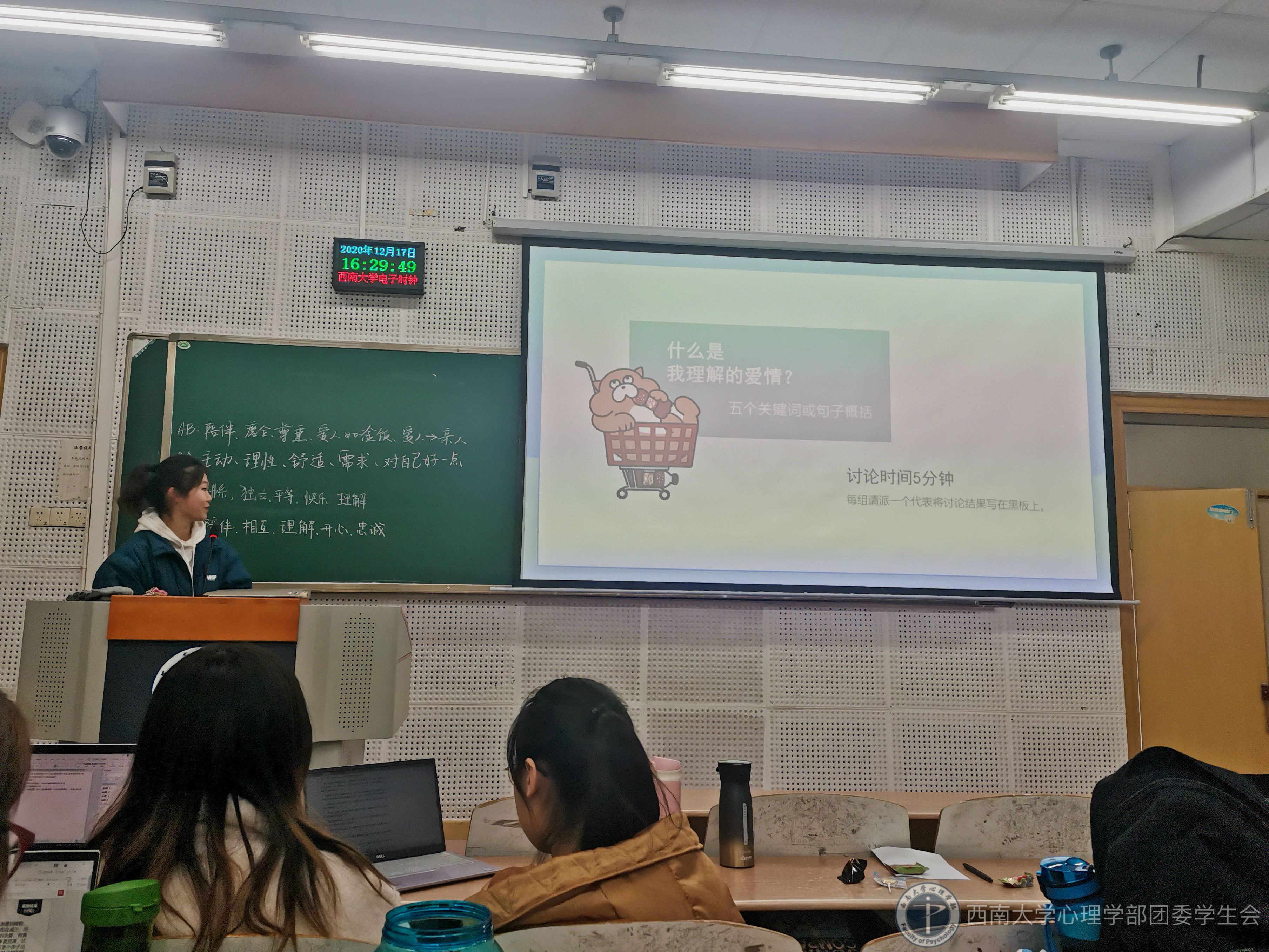 团辅活动由心理委员周霖淼关于大学生不同的恋爱观的话题主持展开。同学们展开了激烈讨论,表达了各自不同的爱情观。这不仅加深了同学们之间的了解,还起到了一定的恋爱观塑造、心理疏导的积极作用。活动进入高潮,文体委员主持迎新年活动,开展游戏环节。该环节包括听歌猜歌名,谁是卧底等游戏。游戏过程中,同学们展现了极强的应变力、反应力与幽默感,拉近了彼此距离。杨周老师也参与到游戏中,走近同学们,师生同台,其乐融融。