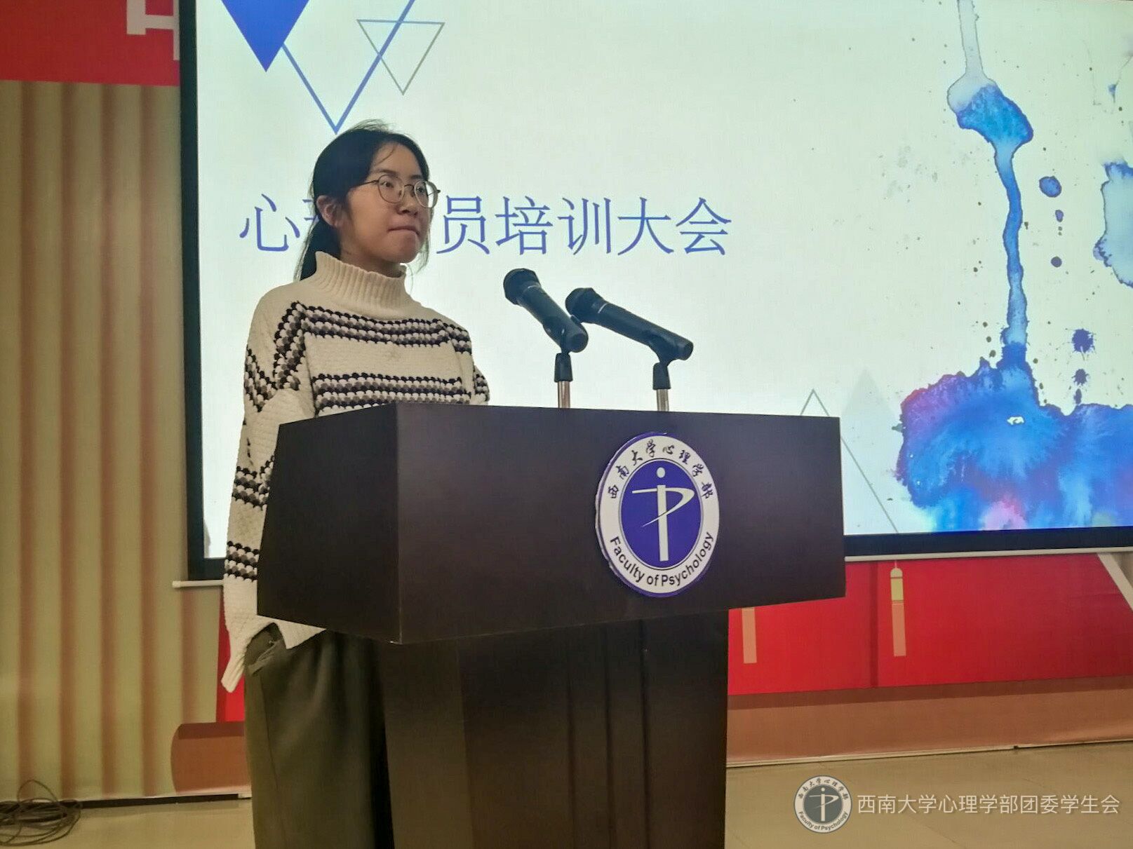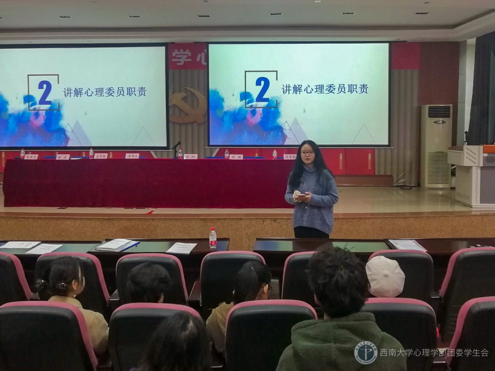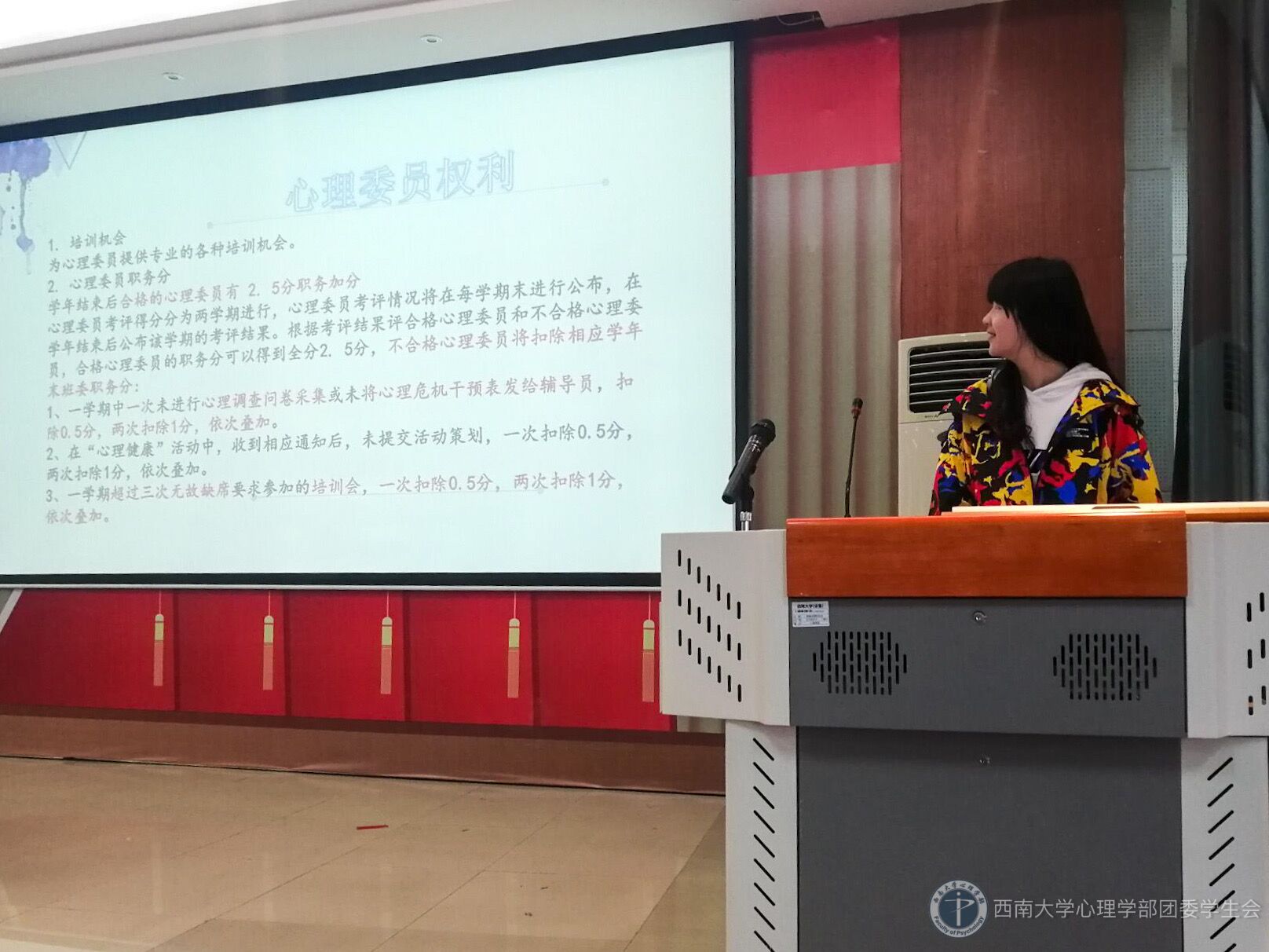 活动伊始,主持人公布了心理委员名单。接下来,志工部部长尹慧灵宣读《心理委员管理条例》,条例包括心理委员的义务以及具体工作。通过讲解,每个心理委员对自己应该承担哪些责任、如何做好一个心理委员等问题有了清晰的认识。随后志工部副部长岳静远为心理委员们介绍心理委员举办活动的注意事项及考核标准,表达了对各位心理委员积极工作的期望。