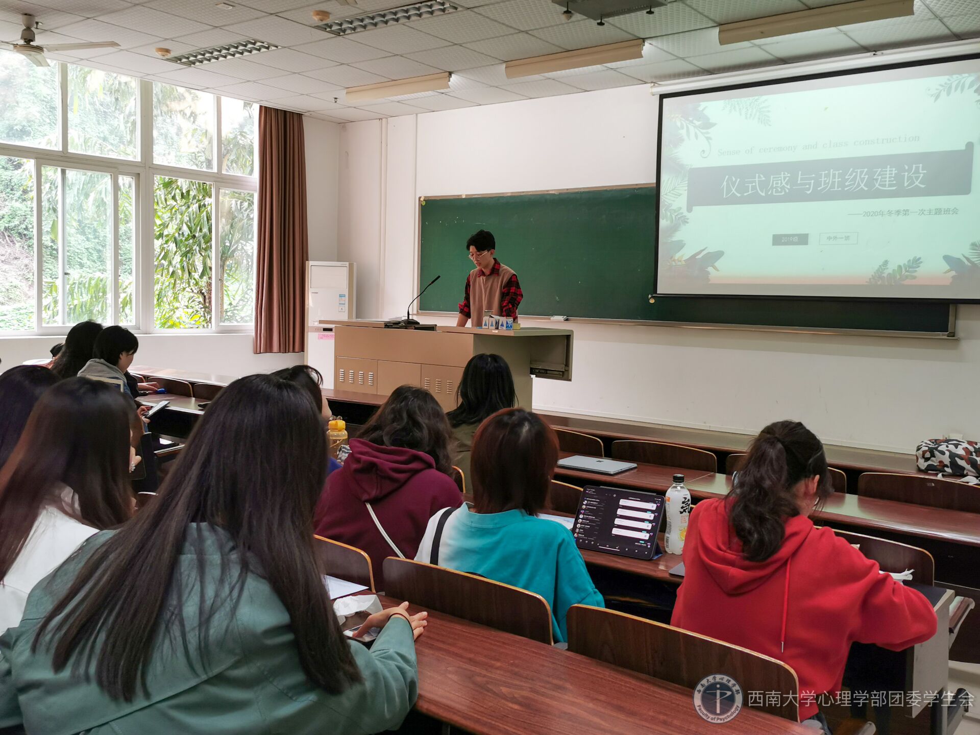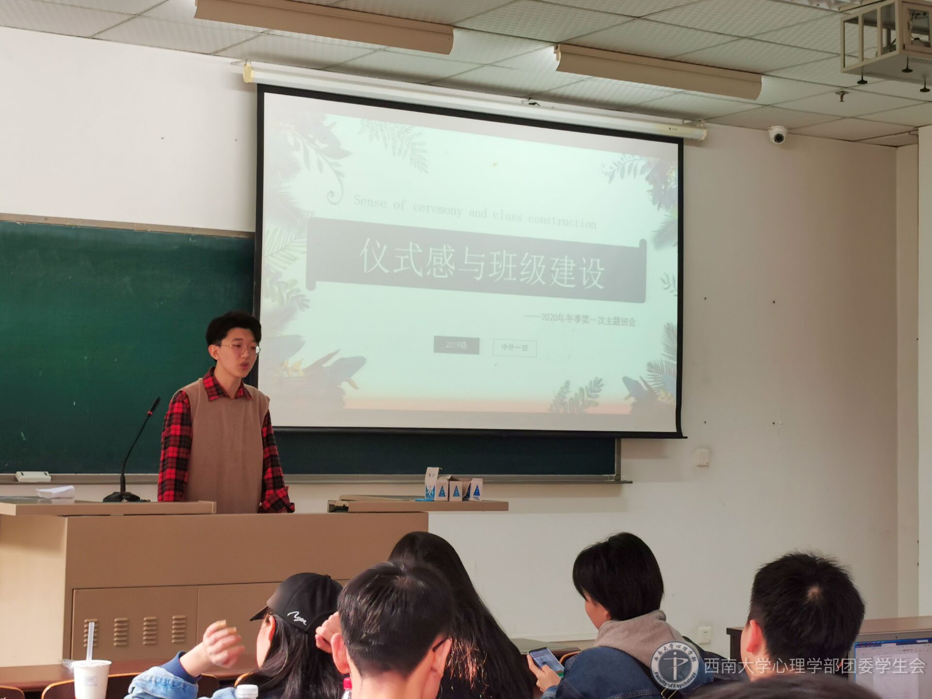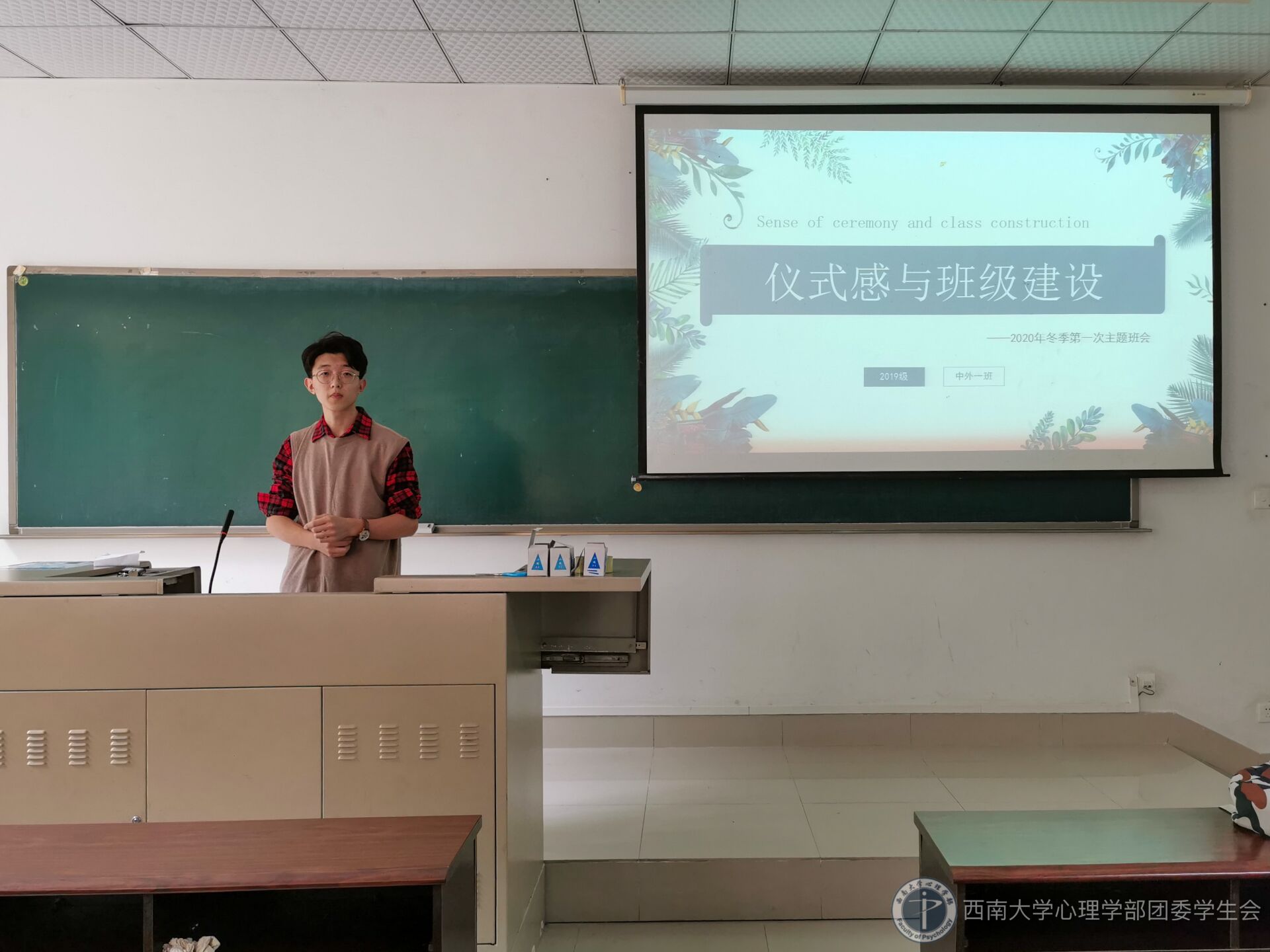 2020年11月9日下午15时,为了让同学们在繁忙的学习中通过仪式感愉悦自己,探寻生活的乐趣,2019级心理学中外1班在26教学楼208教室开展了“仪式感与班级建设”主题班会。
