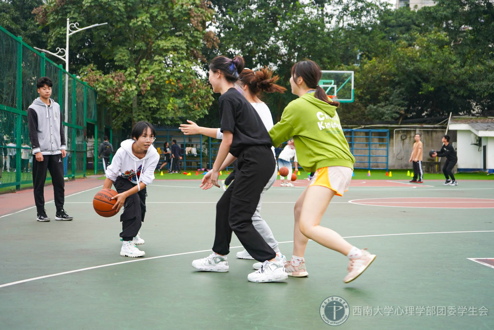 下半场,新老生都换上了全新阵容,比赛进入了白热化状态,虽然新生中有两位同学都是初次接触篮球比赛,但她们配合十分默契。随着篮球的起落,比赛进入了高潮阶段。这个半场中,老生的抢断、防守、进攻都十分激烈,她们凭借着一如既往的默契继续保持着她们的大比分领先优势。双方的严守硬对、激烈争夺、默契传球赢得了观众的阵阵喝彩。天空渐渐飘起了细碎的雨丝,比赛最终以新生惜败告终。