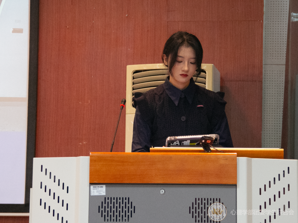 第五位是熊瑛同学,她以自己参加的“承文房四宝之古韵,创宣纸文化之新风”暑期三下乡活动为例,为我们介绍了参加校级三下乡组织的流程,鼓励同学们关注文化传承项目,传承中国传统文化。最后分享的是郭嘉琦和李斯盛同学,他们介绍了必赢776net二级团组织知“心”小屋暑期三下乡活动,分享了面向中小学生群体和社区居民针对性开展心理援助服务的经历。