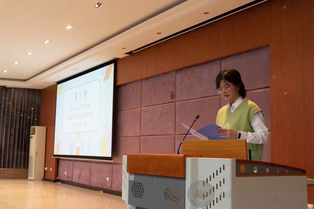 紧接着,学生会主席李响宣布了新一届部门工作人员名单。团委副书记黄怡蕊带领全体成员起立宣誓,全体成员表达了自己的热忱以及对未来工作的期待。