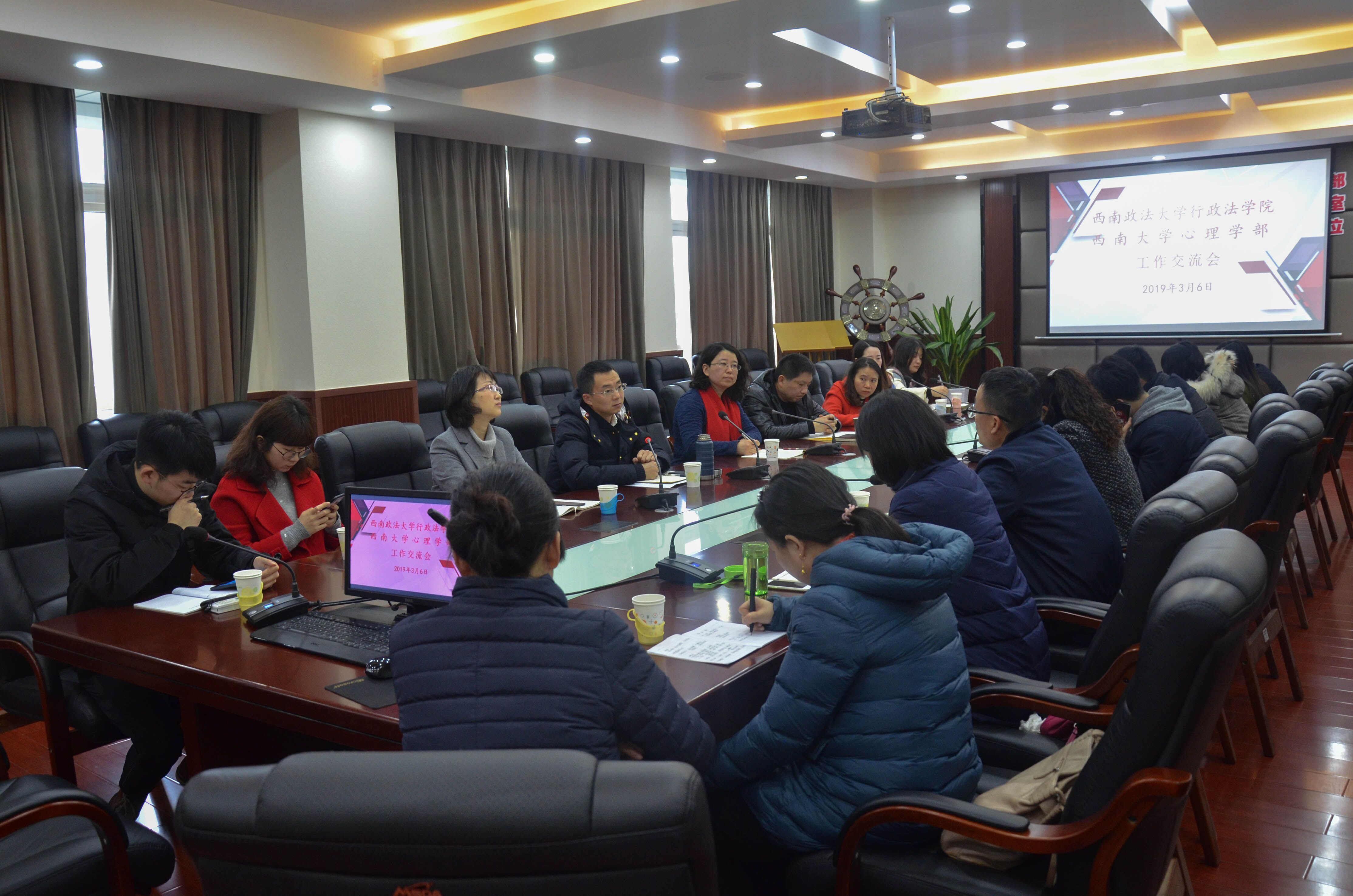 2019年3月6日上午,西南政法大学行政法学院党委书记张渝、副书记蔡伟带领行政法学院学生工作队伍一行13人来必赢776net调研交流,在学部527会议室双方就学生管理和心理健康教育进行了交流座谈。学部党委副书记叶海燕、党委副书记陈诚、学部全体辅导员参加了交流座谈。