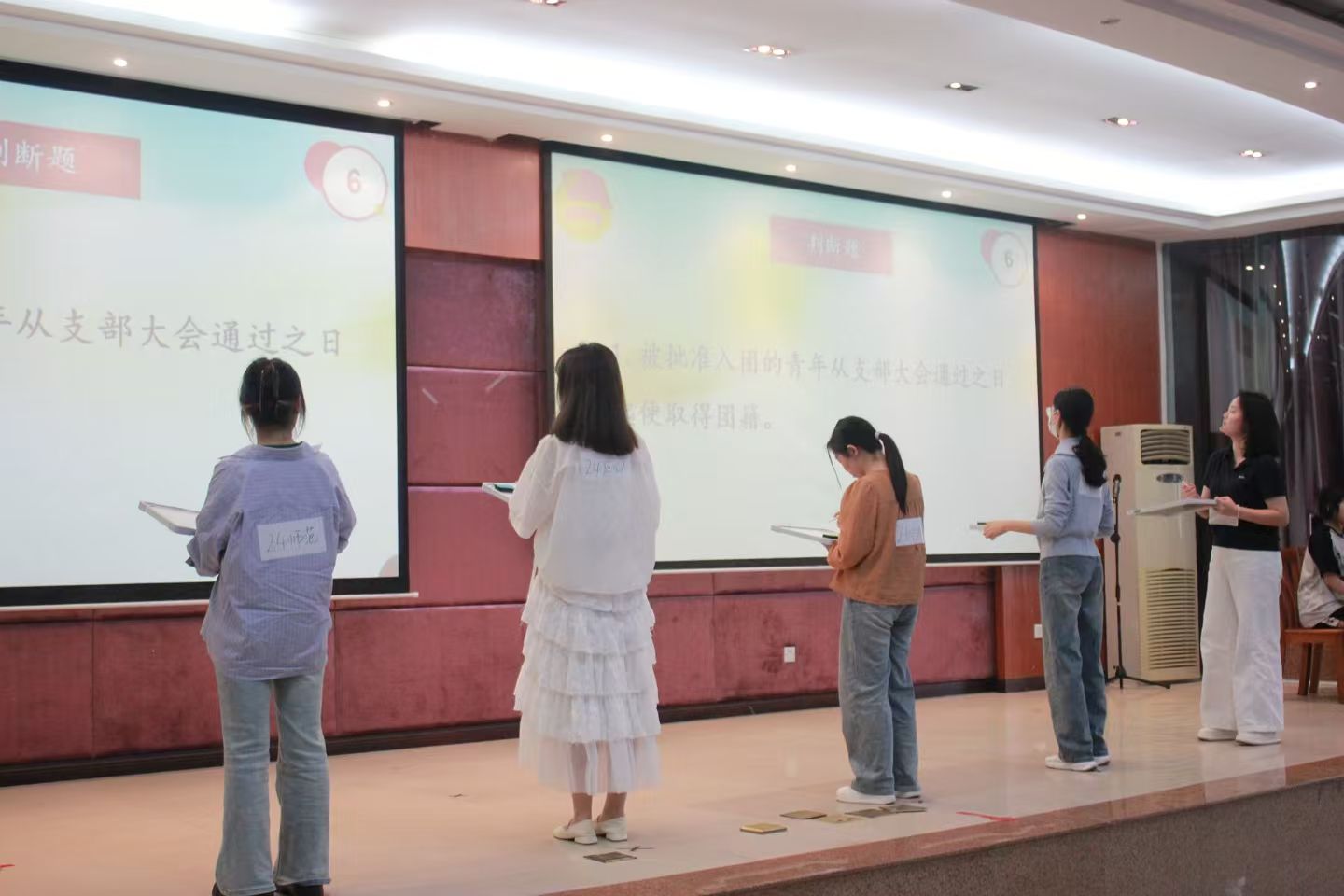 决赛分为轮答题、基础题和抢答题三个环节,题目涵盖团的历史、章程、基本任务等内容。比赛现场气氛紧张热烈,参赛选手沉着应对,展现出扎实的团知识储备和良好的团队协作能力。在轮答题环节,选手们依次作答,稳扎稳打;基础题环节中,判断题的快速反应考验了选手的判断力;抢答题环节更是将比赛推向高潮,选手们争分夺秒,踊跃抢答,赢得了现场观众的阵阵掌声。