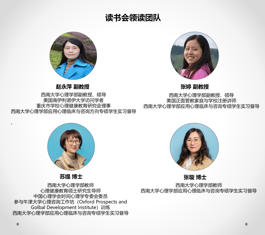 培训班将定期举办心理咨询相关主题读书会,全年共计4次,每次两小时,我们的读书会主持团队如下: