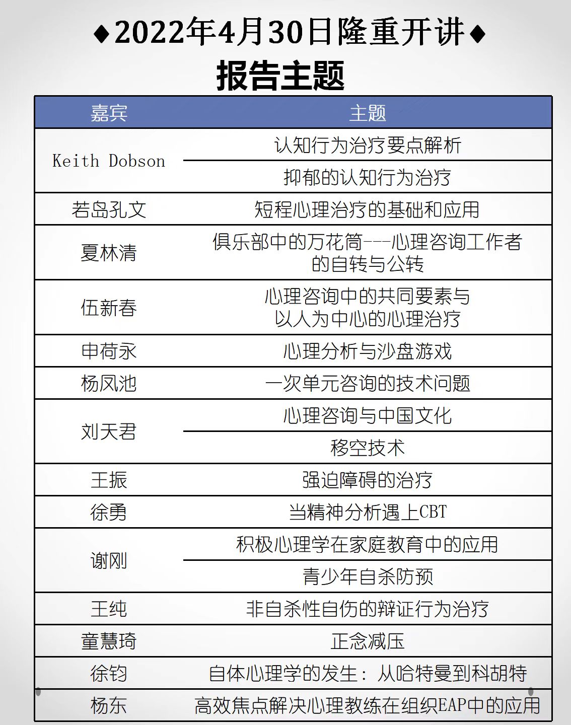 1、 临床与咨询心理学领域国际、国内知名专家17场主题报告: