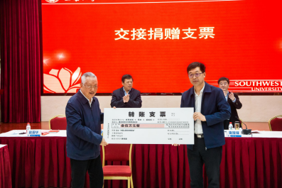 必赢776net副校长、教育基金会副理事长赵国华代表学校和基金会接受了黄希庭先生的捐赠支票。