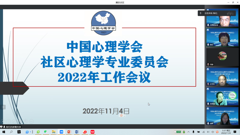 11月4日晚上,社区心理学专委会委员召开了在线工作会议,陈红主任回顾了专委会2021年以来的主要工作,并围绕我国社区心理学理论应用于社区的实践,对如何从中国社区的实际要求出发,在社区心理学理论创新和实践发展中建立中国社区心理学的学科体系、学术体系和话语体系作了交流。专委会副主任苏彦捷、马建青、邓铸、吕厚超和专委会委员时勘教授、许燕教授分别发言,就专委会日常工作梳理、吸纳其他领域的参会者、扩大社区心理学实践基地建设、加强各省市社区心理学专委会建设、学术年会举办地点、社区心理学学科建设和教材建设、社区干部和工作人员培训等话题谈了各自的建议。