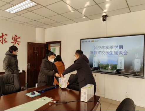 陈诚副书记代表学部关心慰问寒假留校学生,仔细询问每位学生在校期间的学习、生活和家乡疫情情况,了解学生的留校原因和假期规划。他叮嘱学生在寒假期间要遵守学校的各项规章制度,时刻与家人、老师保持联系,温馨提醒同学们在校期间要养成良好的作息习惯,提高防范意识,做好科学防护。他强调学校在生活、安全等方面做了周密的部署,全力保障留校学生的安全。随后,陈诚副书记给寒假留校学生递上慰问品,并祝福同学们新年快乐。