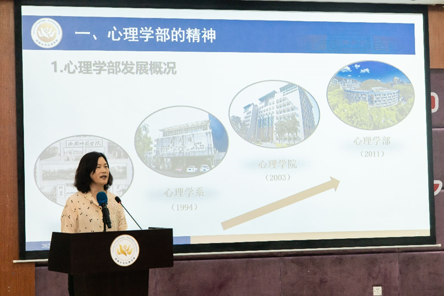 陈红依托“优秀育人团队、大师故事、高水平学科平台”等方面,介绍了学部“优秀的育人平台”。特别从“深沉的爱国情怀”“执着的学术情怀”“朴实的爱民情怀”三个视角向学生们分享黄希庭先生的故事,号召全体新生向黄先生这样的大师学习,深怀爱国之心,坚定不移听党话、跟党走,自觉把个人理想同祖国的前途和民族的命运紧密联系在一起,在砥砺奋进中描绘亮丽的青春底色。