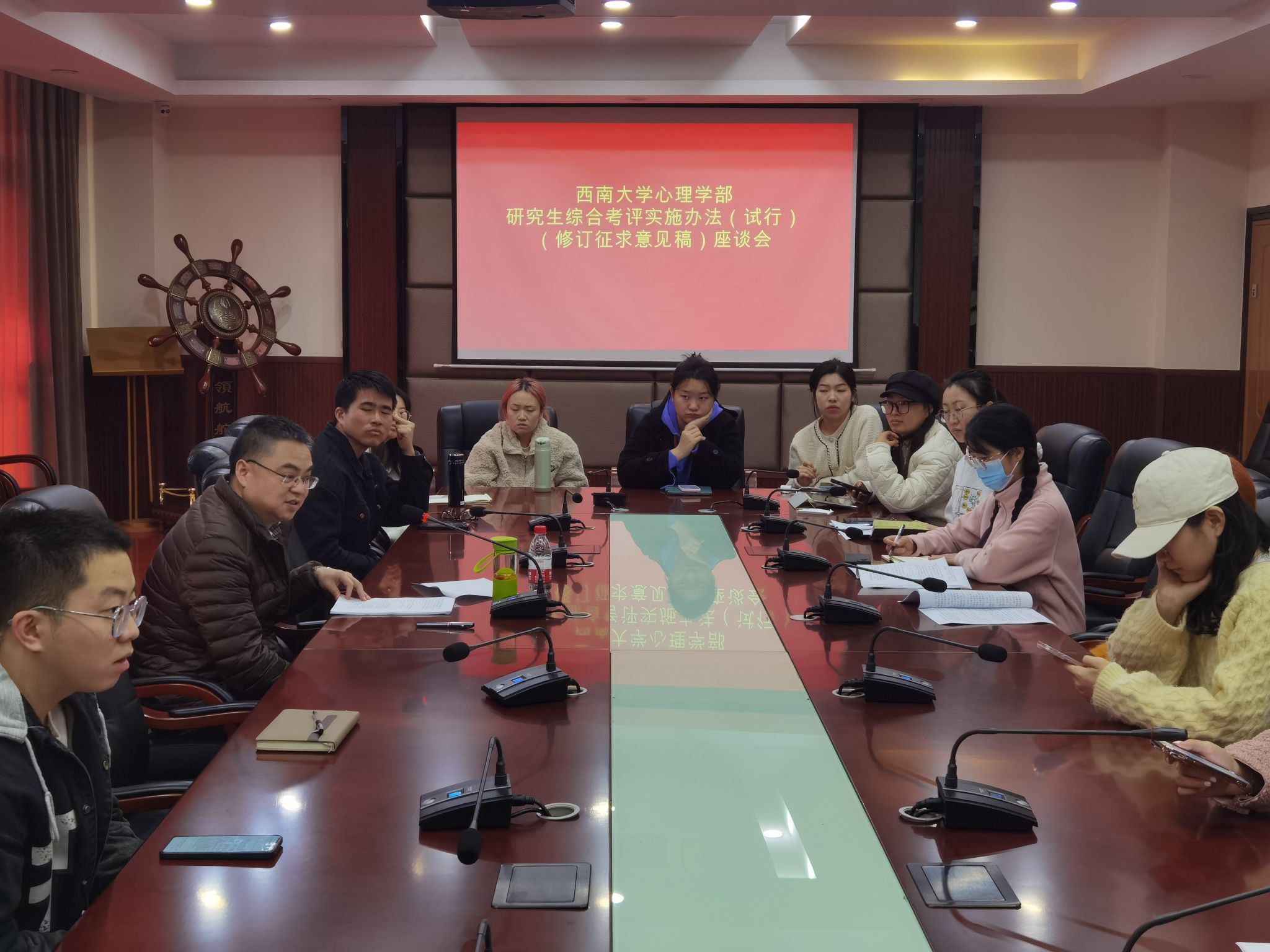 为了加强研究生思想政治教育制度建设,充分发挥制度的育人导向性、规范性和科学性,充分发挥研究生参与学部研究生教育管理的积极性。2023年11月17日,必赢776net研究生奖助学金评审工作组召开调研座谈会,邀请学部研究生团总支、研究生会、“心朗”研究生社会实践与志愿服务团、2022级的学生干部共计20余人,讨论研究生综合考评实施办法(修订征求意见稿)。学部党委副书记、纪委书记王华敏主持会议。