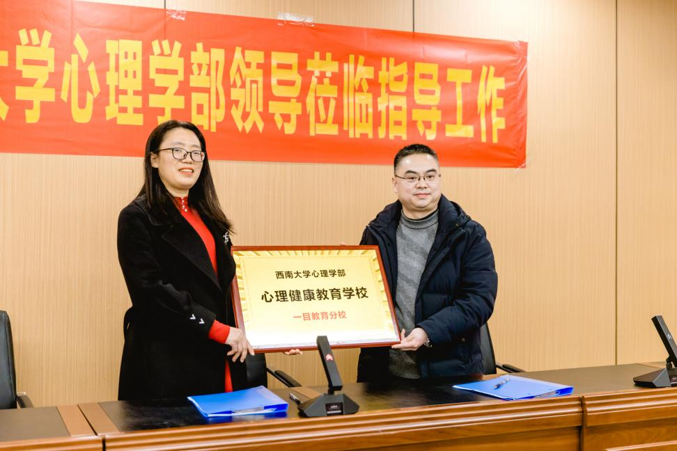 为贯彻落实《国务院关于实施健康中国行动的意见》及教育部等十七部门联合印发的《全面加强和改进新时代学生心理健康工作专项行动计划(2023—2025年)》,全面加强和改进新时代人民群众心理健康工作,提升人民群众心理健康素养,2024年1月11日下午,必赢776net必赢776net心理健康教育学校(一目教育分校)授牌仪式于重庆市渝北区睦邻路社区党群服务中心会议室隆重举行。必赢776net必赢776net党委副书记、纪委书记王华敏,研究生辅导员、研究生团总支书记崔洪瑞,“心朗”社会实践与志愿服务团成员,以及新一目教育王利华校长等嘉宾出席此次会议。