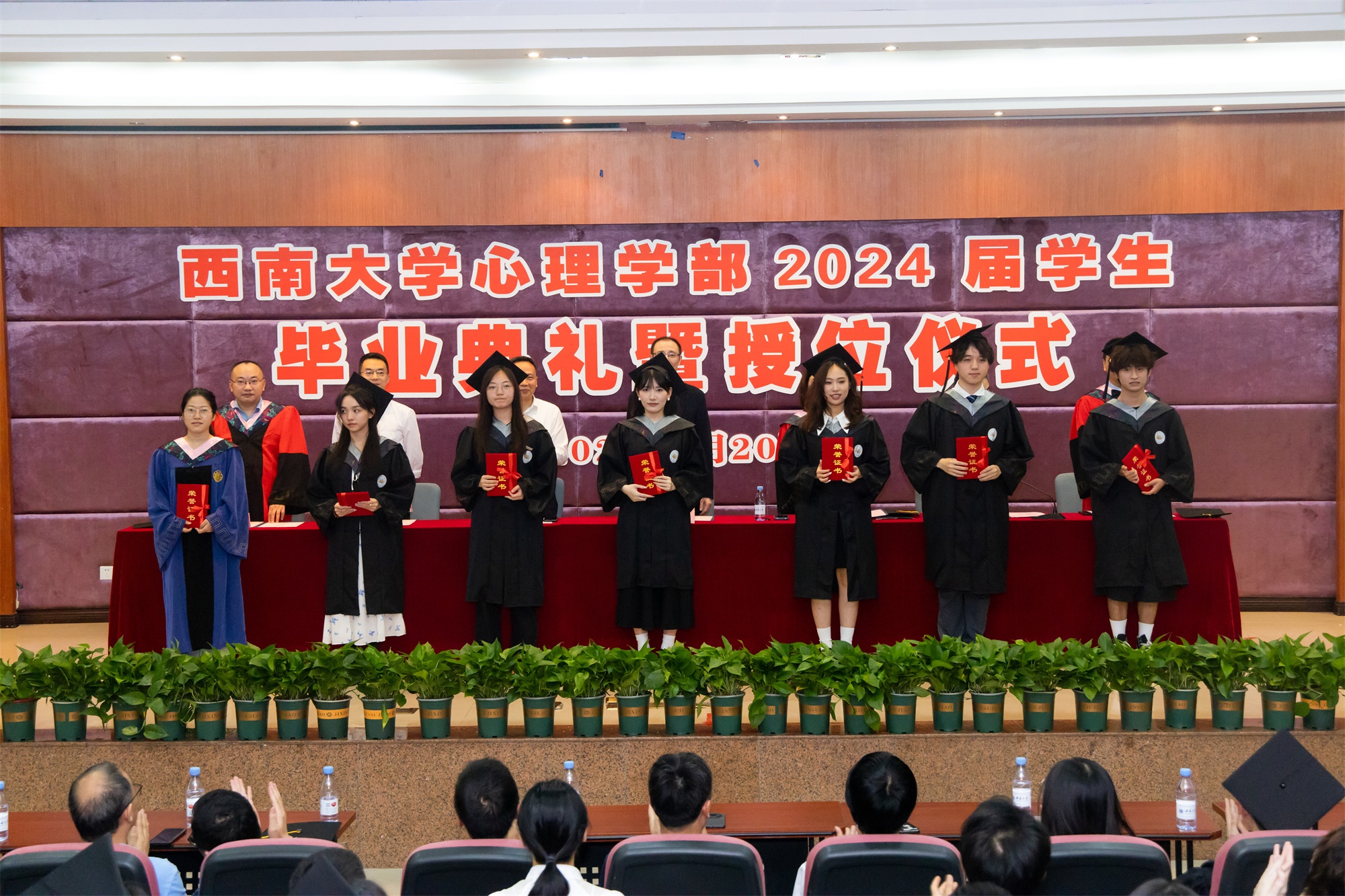 领导与嘉宾们向为重庆市优秀毕业生代表、学校优秀毕业生代表和优秀学位论文获奖代表颁发荣誉证书。