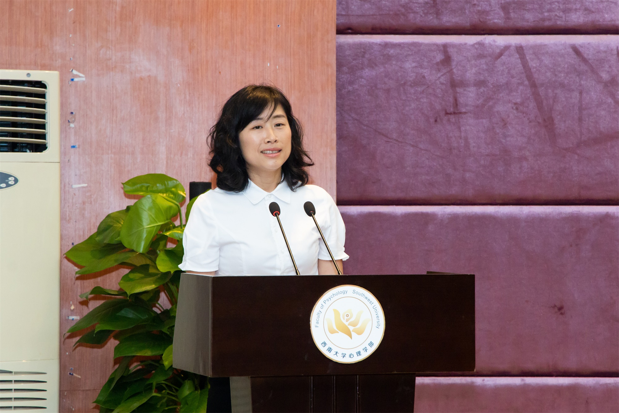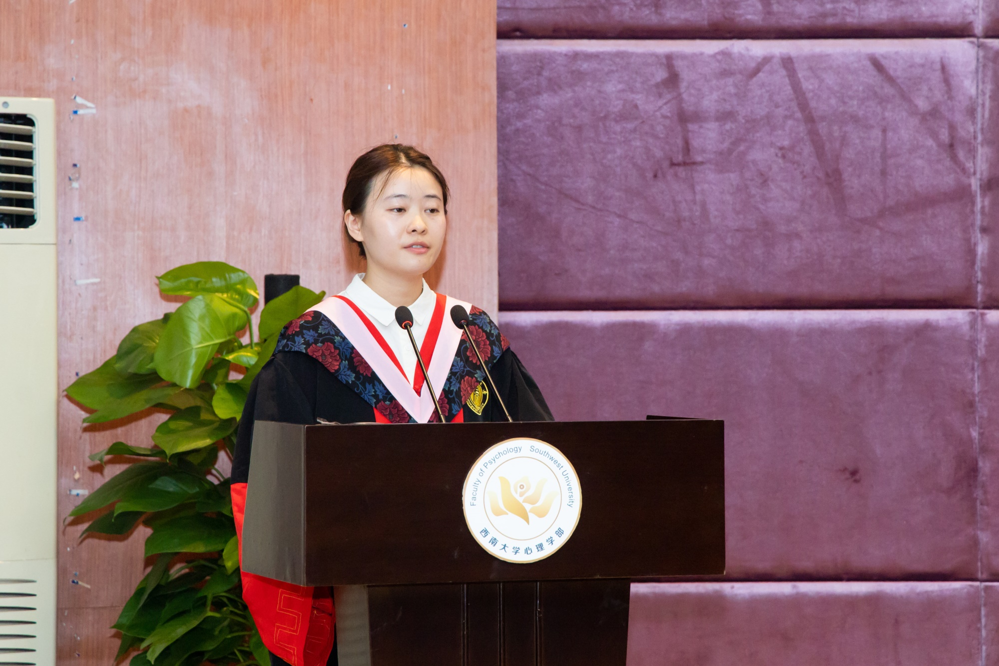教师代表杨娟寄语毕业生。她亲切地称毕业生们为“小红薯”,表达自己作为老师对同学们的牵挂,强调“拥有健康的高自尊,做幸福的进取者”的重要性。她叮嘱同学们在未来的道路上要“心中有爱,一往无前”,成为一名内外兼修的西大心理人。