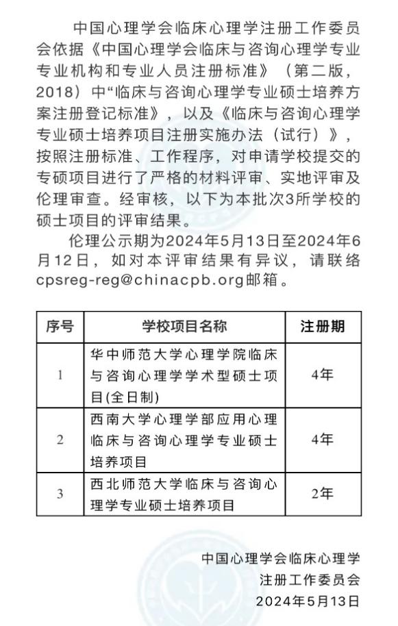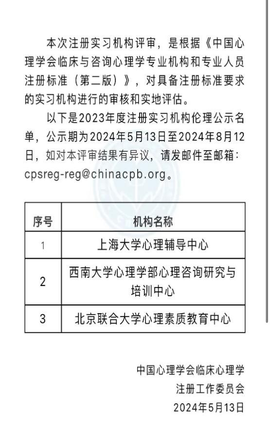中国心理学会临床心理学注册工作委员会(简称“注册系统”)依据《中国心理学会临床与咨询心理学专业机构和专业人员注册标准》(第二版),在对学部心理咨询研究与培训中心(简称“咨询中心”)和临床与咨询心理学专硕培养项目进行了材料评审、实地评审、伦理审查及公示后,通过了注册系统认证。其中,学部心理咨询中心为注册实习机构,学部临床与咨询心理学专硕培养项目获得为期四年注册认证,这是继北京师范大学、北京大学之后,成为全国第三个获得注册期为四年的临床与咨询心理学专硕培养项目,为学部建系30周年献上厚礼。