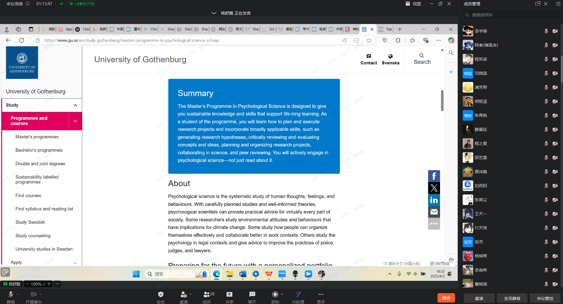 留学分享环节,来自21级心理学专业的程之夏同学目前已收到香港大学的offer,她从择校策略、申请前的准备、择校经验:中介选择、申请材料准备等方面为同学们进行了充分分享,并将详细的申请物料分享给同学们。来自21级心理学专业的杨舒鹏目前已收到瑞典哥德堡大学的offer,他从择校注意事项、地区和城市的选择、硕士项目申请等方面,为同学们分享了如何DIY申请海外留学。