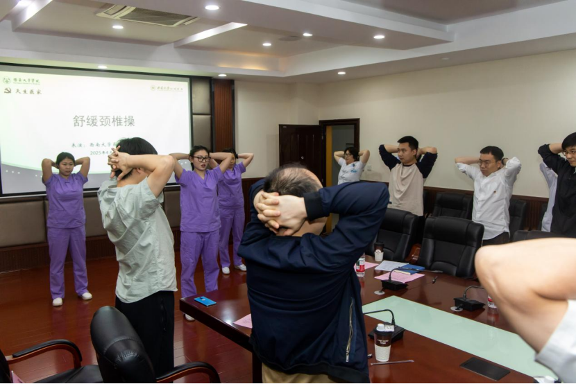 讲座将理论知识与技能教学结合,以生动实用的讲解、简便有趣的互动体验,让老师们在较短时间内迅速掌握了颈椎养护的技巧。