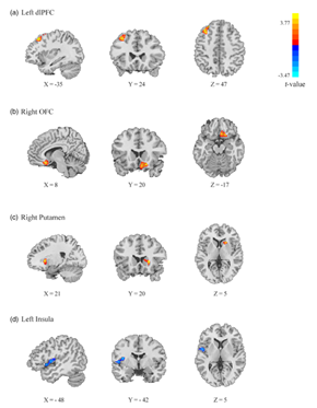 VBM结果表明,尽责性的时间相关维度(Time_Consci facet)与左背外侧前额叶、右侧眶额叶的灰质体积呈正相关(图1,a-b),非时间相关维度(Nontime_Consci facet)与右侧壳核的灰质体积呈正相关,而与左侧脑岛的灰质体积呈负相关(图1,c-d)。
