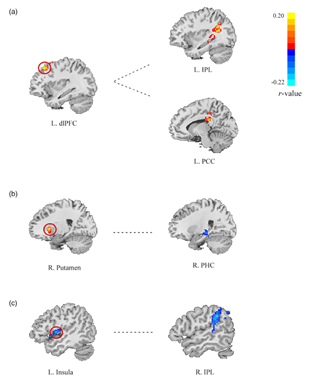 图2. 尽责性与大脑静息态的功能连接(左侧表示定义的种子点,右侧表示与尽责性存在显著相关的功能连接脑区;GRF 矫正,voxel p < .005,cluster p < .05)