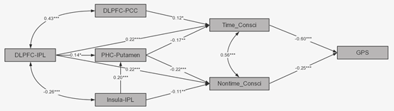 图3. 整合功能连接的结构方程模型(*p < .05, **p < .01, *** p < .001)