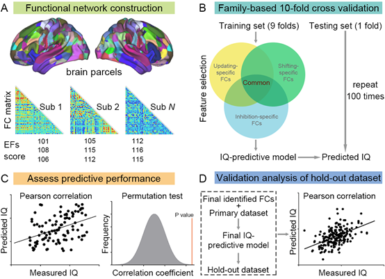 鉴于此,课题组利用人脑连接组计划(Human Connectome Project)S900数据库作为主样本,在交叉验证的机器学习框架下,通过训练集筛选出EFs三种成分相同的和特异的功能连接,分别与流体智力与晶体智力分数构建回归模型,并成功地预测了测试集中个体的智力分数。此外,基于主样本建立的预测模型还可以泛化到新的测试集中。结果显示EFs各成分的静息态功能连接均对不同智力类型(尤其是晶体智力)有显著的预测效果,这有助于从脑网络的角度理解EFs与智力的关系。此外,考虑到智力可以从EFs相关的认知训练中受益,该研究结果也对选择特定的EFs训练方法有重要启示。