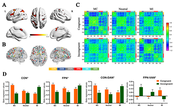 图 1. 核磁数据分析结果。(A) 激活结果;(B) 网络分析中选取的所有节点,节点颜色标识节点所属的脑网络,网络名见图中央的彩条;(C) 在3 (Context: MC, Neutral, MI) × 2 (Congruency: C, I)共6个条件下的脑网络连接矩阵图,网络名同图B。(D) 网络内/间连接变化的部分结果。CON-DAN网络间连接强度(右2)与FPN-VAN网络间连接强度(右1)随任务变化表现出相反的变化趋势。