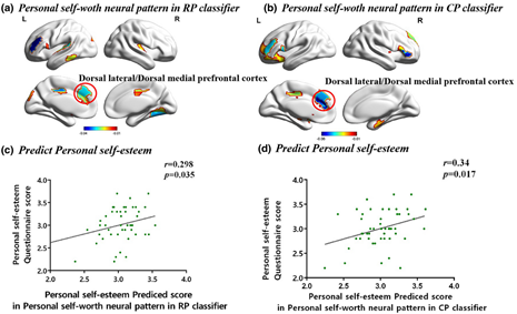 Multivariable pattern classification differentiate relational self-esteem from personal self-esteem一文通过训练分类器法区分关系自尊和个体自尊,发现分类器可以有效区分两类自尊。同时区分关系自尊的多元神经信号广泛分布在背内侧前额叶、颞顶联合区、楔前叶和后扣带皮层。区分个体自尊的脑区分布在纹状体、壳核、脑岛和后扣带皮层(图一)。为了验证结果的稳定性,在另外独立的样本中进行验证性分析,发现关系自尊的多元神经模式能显著区分关系自尊。