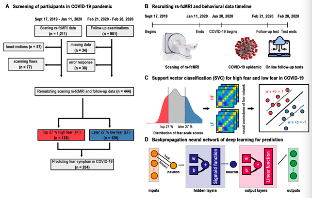 为此,冯廷勇教授团队开展一项采用疫情前恐惧相关的神经网络来预测疫情中个体的恐惧程度的研究。本研究基于前期建立的中国人人格特质的多模态脑影像数据库,在中国疫情严重期(2020.02.21—2020.02.28)在线采集了恐惧等行为数据,个体的脑影像在疫情前完成采集(2019.09—2020.1)(图1)。