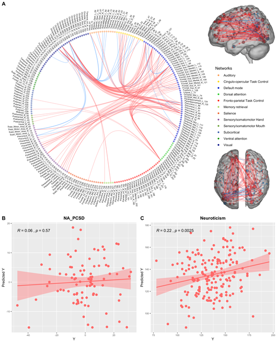 该研究基于不同负性情绪体验的主成分,结合静息态脑网络的变异性,探讨负性情绪特质性与状态性的认知神经机制。首先,通过对焦虑,抑郁,消极情感等五个负性情绪问卷的主成分分析,获得负性情绪指标。然后将负性情绪指标与静息态全脑功能连接进行关联分析,确定负性情绪相关的功能连接(并在另一样本上重复验证),继而根据功能连接的变异性,将相关功能连接分为高、低变异性两组。最后,将两组功能连接分别用于预测个体的神经质水平(作为负性情绪的特质性指标)和负性情绪水平的波动(作为负性情绪的状态性指标)。结果发现,低变异性的负性情绪相关功能连接主要分布在默认模式网络内以及默认网络与背侧注意网络之间,并显著预测负性情绪的特质性而非状态性(如图)。高变异性的功能连接主要是默认网络与腹侧注意网络间、额顶网络和默认网络间,并显著预测负性情绪的状态性而非特质性。