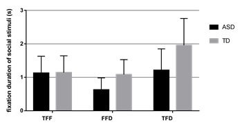 图1. ASD组和TD组在初始定向时间(TFF)上不存在显著差异 [ T (45) = -0.74, p = 0.471] ,在首次注视时间(FFD)和总注视时间(TFD)上均存在显著差异 [ TFFD(45) = -3.67,p < 0.001; TTFD (45) = -3.34, p < 0.01] ;与TD组相比,ASD组对社会刺激的首次注视时间和总注视时间较低。