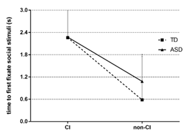 图4. 当社会刺激与局限性刺激配对时,ASD和TD儿童都优先注意局限性刺激,而当社会刺激与非局限性刺激配对时,ASD儿童在社会注意阶段的定向能力与TD组没有差异[F (1,50) = 61.491, p < 0.001, η2 = 0.552];当社会刺激与局限性刺激配对时,ASD组和TD组更倾向于处理局限性刺激,但当社会刺激与非局限性刺激时,ASD组对社会刺激的总注视时间较低 [F (1,50) =24.84, p < 0.001, η2 = 0.332]