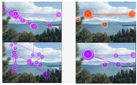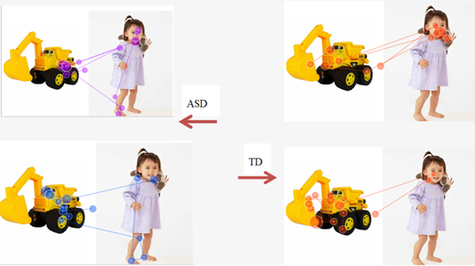 背景检索任务发现,自闭症儿童在社会注意阶段的初始定向能力是正常的,但对社会刺激的后续加工处理存在困难。也就是说,在嵌入社会刺激的自然场景图片中,自闭症患儿能够成功检索定向到社会刺激,但是难以维持持续的社会注意,不能够对社会刺激进行深入加工(如图1)。同时对数据进行可视化分析发现,与正常儿童相比,自闭症患儿的注视轨迹图更加分散,注视点多而乱,每个注视点时长都较短(如图2)。