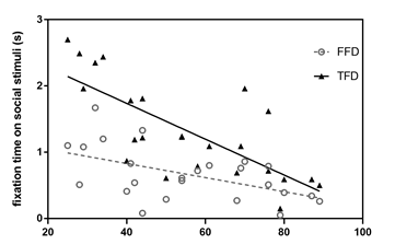 图3.自闭症症状的严重程度(ABC得分)与社交刺激的注视时间(FFD/TFD)之间的相关分析散点图[ rFFD (24) = -0.523,r TFD(24) = -0.74]