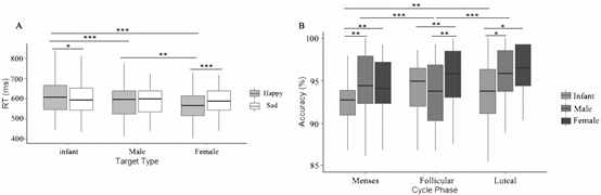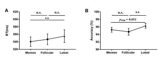 为了确定在生理周期内两种卵巢激素对女性加工社会信息的具体影响,必赢776net必赢776net陈安涛教授带领的研究团队分别在女性的月经期、卵泡期和黄体期使用情绪面孔flanker任务和注意网络任务(ANT),探索女性社会信息加工的周期性改变是否与注意分配有关。该研究将卵巢激素水平与行为表现结合,收集到的数据在R语言中使用lme4和lmerTest软件包进行线性混合模型的分析。结果发现在情绪面孔flanker任务中,被试在悲伤面孔条件(目标刺激为悲伤面孔、干扰刺激为悲伤面孔或快乐面孔)下的反应时与孕酮水平呈显著的正相关(图2),说明高水平的孕酮可以为有关生存和适应的社会性刺激分配更多的注意资源。并且,黄体期女性在两个任务中表现出相同的行为模式,即相比其他两个阶段,黄体期女性的反应时显著延长但正确率显著上升(图3)。说明黄体期的女性采取了相对保守的策略,通过将更多的注意分配给目标来获取更高的正确率。