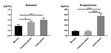 图1:女性月经期,卵泡期和黄体期唾液中雌激素和孕酮的水平