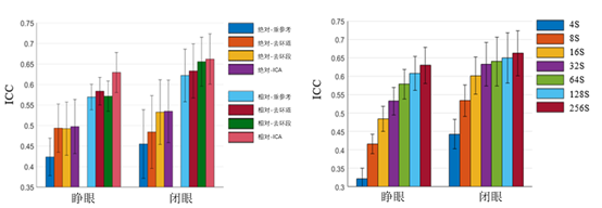 图1. 预处理和数据时长对于头表功率谱重测信度的影响