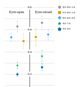 该研究收集了57名大学生志愿者三次不同时间下的静息态脑电数据。通过计算脑电功率谱和功能连接的组内相关系数(ICC),研究者发现随着数据时长以及预处理步骤的增加,会明显地提升测量结果的重测性(图1)。这种提升在睁眼和闭眼条件下的表现是不同的,闭眼条件的重测性更高。该研究还调查了进行脑电溯源之后,大脑皮层活动的重测性。发现枕顶叶区域的重测性最高,而前额和边缘区域的重测性较低。更重要地是,研究者系统地比较了静息状态(睁眼/闭眼),功率谱的计算方式(绝对功率/相对功率),信号所处的空间(头表电极/源空间)以及不同功能连接指标的重测性表现(图2)。该研究的结果可为以后的脑电研究及应用提供实验设计和数据分析上的参考,有助于心理学研究‘可再现性’的提升。对基于静息态脑电的大队列追踪研究,具有重要参考价值。