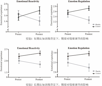 近期陈安涛教授团队发表文章揭示在认知训练的背景下,认知增强的暗示会提升个体情绪调节的效果。即,无论在短期(实验1)还是在长期(实验2)的认知训练背景下,通过认知增强有关的言语暗示来增加个体的改善期望后,期望组被试从前测到后测的情绪调节效果都得到了显著的改善;而控制组并未发生显著变化。这提示,在认知训练中,来自言语的改善期望可能影响情绪调节的效果。在今后的干预研究中,需要匹配干预组和控制组的期望以排除安慰剂效应的干扰;或者利用期望的增强效应使认知训练的迁移效果最大化。
