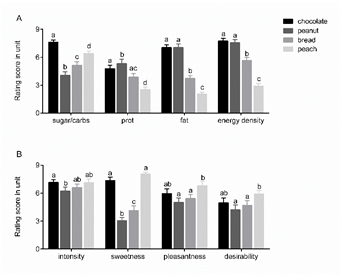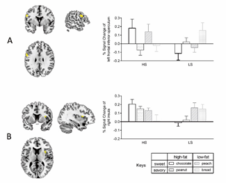 基于对甜味的敏感程度(阈限感受值),将志愿者分为甜味高敏感度(high sensitivity;HS)和甜味低敏感度(low sensitivity;LS)两组。为了探究和对比两组被试在加工食物中不同营养素的脑激活情况,研究选取了四种食物气味,分别代表高脂高糖(巧克力气味)、高脂低糖(烤花生气味)、低脂高糖(桃子气味)和低脂低糖(面包气味)食物,在控制饥饿度等相关指标后,对两组志愿者进行了功能性核磁共振扫描。在完成脑影像实验后,两组志愿者对四种食物气味的强度、甜度、愉悦度、渴望度以及每种气味代表食物的糖、脂肪、蛋白质含量和热量密度分别进行评分。