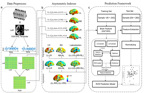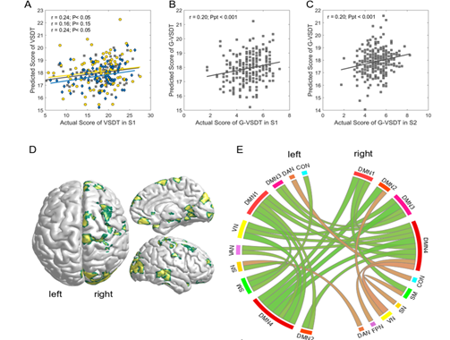 本研究拟利用静息态功能成像数据,从个体差异的视角探索双侧半球的交互模式与创造性思维的关系,且考察了两种典型的创造性加工任务:视空创造性和言语创造性。本研究利用基因-脑-行为(GBB) 数据库中502名大学生的结构和静息态功能数据以及多种测量工具获取的创造性思维得分,采用多变量预测模型和交叉验证的方法探测半球分化和整合指标对视觉空间发散性思维和言语发散性思维的预测效果(图1)。结果发现,个体的视觉空间发散性思维表现可以通过视觉网络、感觉运动网络和默认网络中的部分脑区的右半球偏侧化程度来预测(图2)。相反,涉及复杂语义加工(例如,外侧颞叶和额下回)和认知控制加工(例如,额中回和顶上小叶)的脑区在半球之间的平衡性可以预测较高的言语发散性思维表现。该研究表明视空创造性能力更多依赖于右半球加工,而言语创造性更依赖于左右大脑的协同加工。此外,该研究在一定程度上支持了创造性思维的半球交互模式取决于任务加工方式。