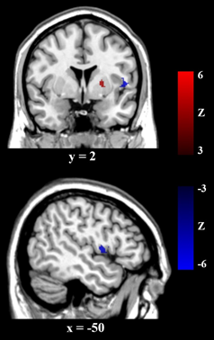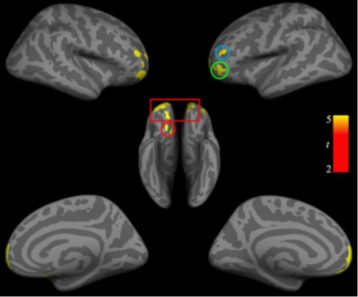 图1:VBM结果发现LOL组在前额叶皮层区域具有较低的灰质体积