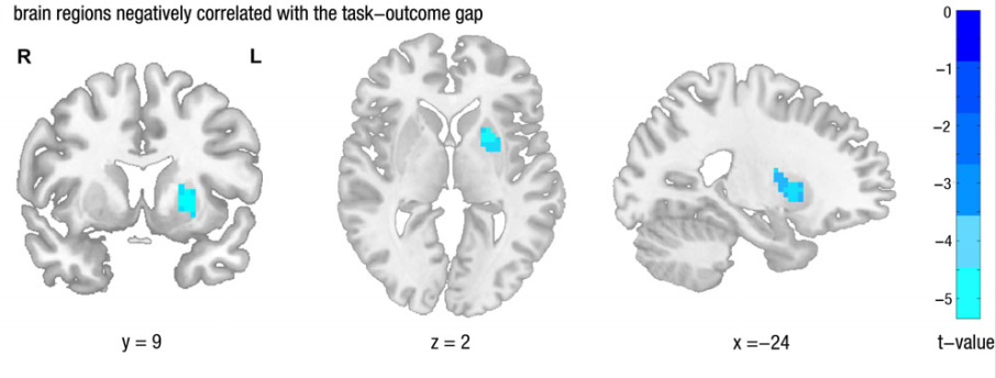 图2:任务与结果的联结越弱(任务结果的间隔越大)壳核(putamen)的脑活动越弱。