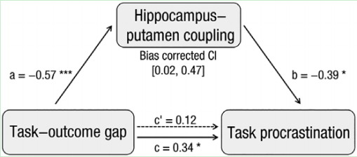 showed that tasks that are more likely to be procrastinated are associated with less value in incentive outcomes. Interestingly, procrastination was more likely if it was more difficult for participants to associate a task with its valued incentives when thinking about the task (i.e., the decreased taskoutcome association). On the neural level, higher value of rewarding outcomes was correlated with increased putamen activations, which further negatively predicted task procrastination. On the other hand, when participants were associating tasks with the incentive outcomes, the decreasing taskoutcome association corresponded to decreasing activation in putamen, and a decreasing hippocampus-putamen coupling which further mediated the effect of the insufficient task-outcome association on procrastination. In particular, the current findings show that procrastination is more likely when people are less able to associate tasks with highly valued incentives, which is accompanied by reduced hippocampal–striatal interactions during task construction.