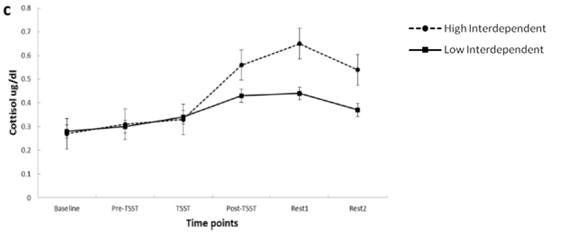 图2 在进行急性心理应激任务TSST之后,高互依自我构念的个体在主观应激报告、心率和皮质醇水平上均反映出了更高的应激水平