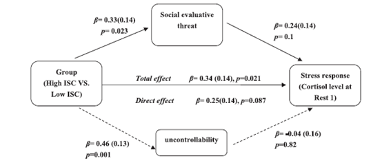 图3 中介分析发现接受到较高的社会评价威胁是高互依自我构念个体出现高应激反应的主要原因