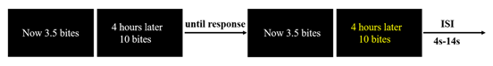 为解决这个问题,首先我们采用巴瑞特冲动问卷(BIS-11)、耶鲁食物成瘾问卷(YFAS)等对被试的特质冲动性进行测量。接着采用虚拟的食物延迟折扣任务来测量决策冲动性,先给被试呈现一个标准的白色小立方体(边长1.58厘米),告知被试这就是一个标准“口”的大小(可以想象为自己最喜欢的食物咬一口的多少)。接着被试以标准“口”为单位,在不同延迟时间和不同数量的食物数量(如现在吃3.5 “口”和4小时后吃10“口”)之间做出选择。以此来探究超重肥胖者和正常体重者之间决策冲动性的差异及其背后的神经机制。